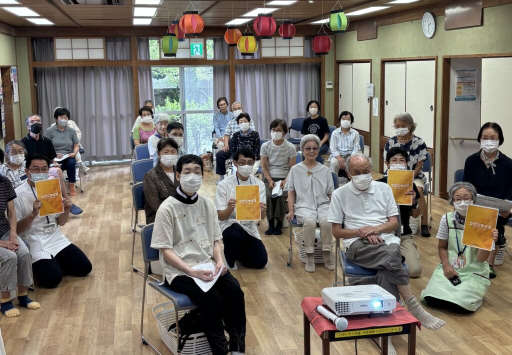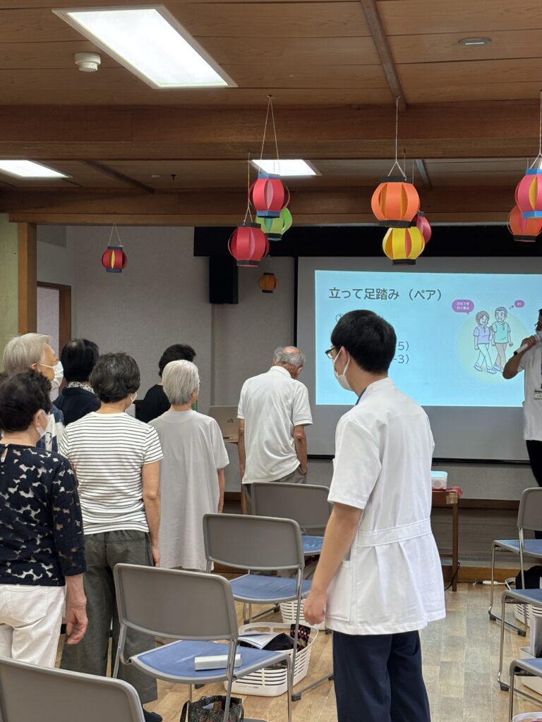 今回のテーマは「コグニサイズ~認知症予防体操でいつまでも元気に~」 講師には、リハビリ実習生も加わり認知機能と運動機能を同時に刺激する体操を、楽しく分かりやすく指導いただきました。実習生にとっても、地域の皆さまとふれあう貴重な体験となりました。